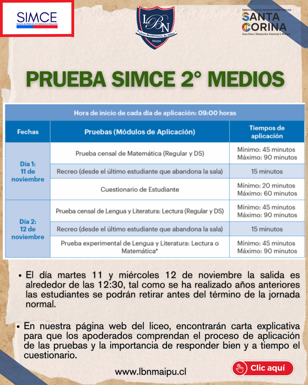 Estimada Comunidad, el día martes 11 y miércoles 12 de noviembre, se rendirá el simce para las(os) estudiantes de 2° Medios